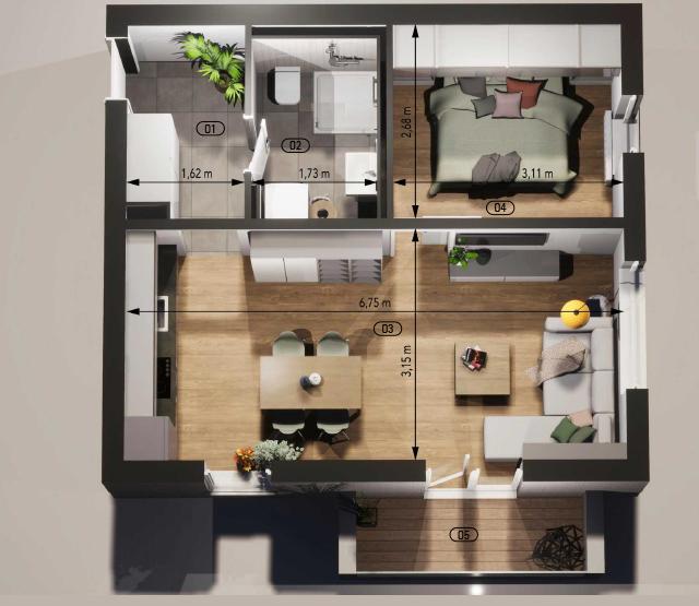 | 03 Koupelna + WC | 4,30 m2 |